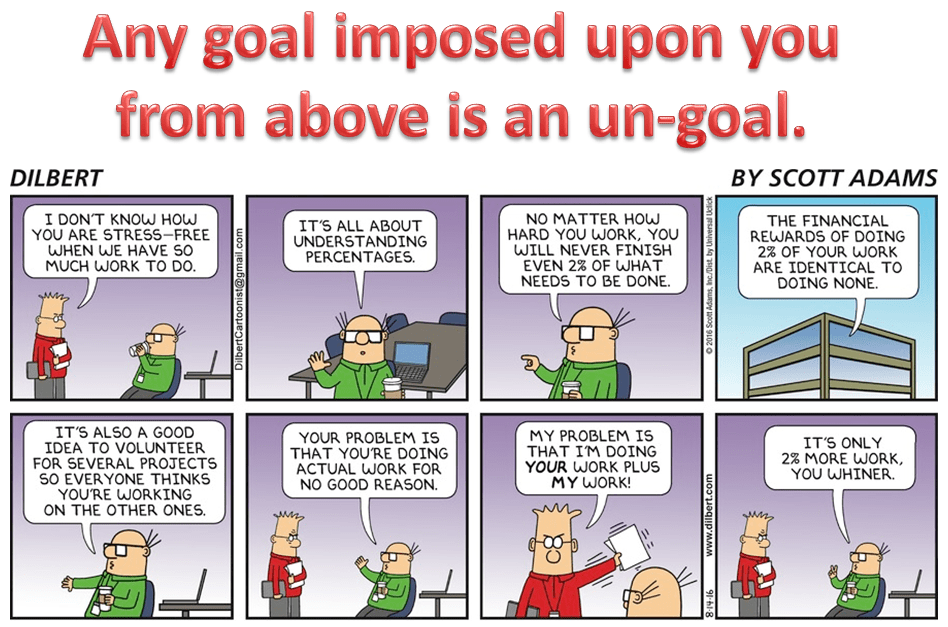 Goals are everywhere at work – it’s hard to find many companies that do not engage in some sort of annual or semi-annual goal-setting regimen. At some point in the year, usually at the start of a fiscal year or after bonuses and raises have been paid, the organization’s senior leaders set their goals for the upcoming 6 or 12 months, and then share them with their teams. Each team member looks at each of the leader’s goals, and figures out what to do to advance that goal, and thus sets a sort of minigoal that reflects some part of the leader’s goal. This continues down the chain, until you, and every other employee, has a set of goals that are miniversions of some larger goal further up in the organization. In some organizations, goals are also grouped into categories, so that each person is asked to set, say: strategic goals, operational goals, people goals, and innovation goals.