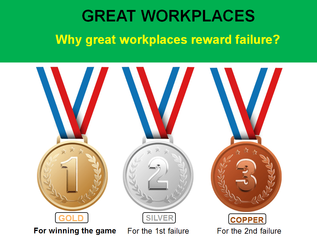 Let me start this article by recalling how things go whenever there is a competition in sport, be it the WorldCup, the Olimpics, Championships, or any other types of competitions where athletes must demonstrate their talent. What happens every time when the game is over? There is not a podium only for 1 winner, instead it’s for 3 best winners. The other participants are winners too, simply because they qualified to participate at the general competition. In every game you play and you don’t win, as often happens, that doesn’t mean you have lost. No, it’s either you win or you learn something, and you’ll probably win by next time. The winner takes the gold medal, yet the 2nd loser and the 3rd loser get a medal too, silver for the 2nd and copper/bronze for the 3rd. The 2nd and the 3rd both failed, and still got rewarded. Why? Well… it must be quite obvious, they will be highly motivated to be better next time and one of them will be the next Nr. 1. This analogy is very much valid at any workplace as well.