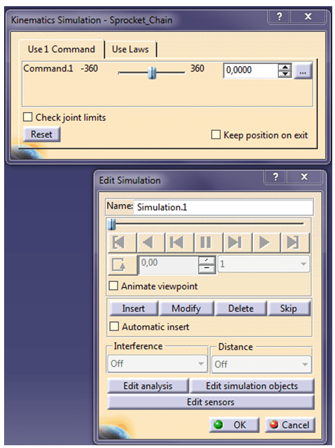 As you have already noticed at the first view the slider in the Kinematic Simulation dialog box is positioned in the middle and the Edit Simulation dialog box is inactive, so all what you can do in order to see a motion is to move the slider in the first dialog box to the left and to right but that doesn´t help you much. To preform a useful simulation you must insert at least one value. As I´ve mentioned earlier with this function we can simulate a mechanism in different positions all in one session. So let´s insert 4 values.
