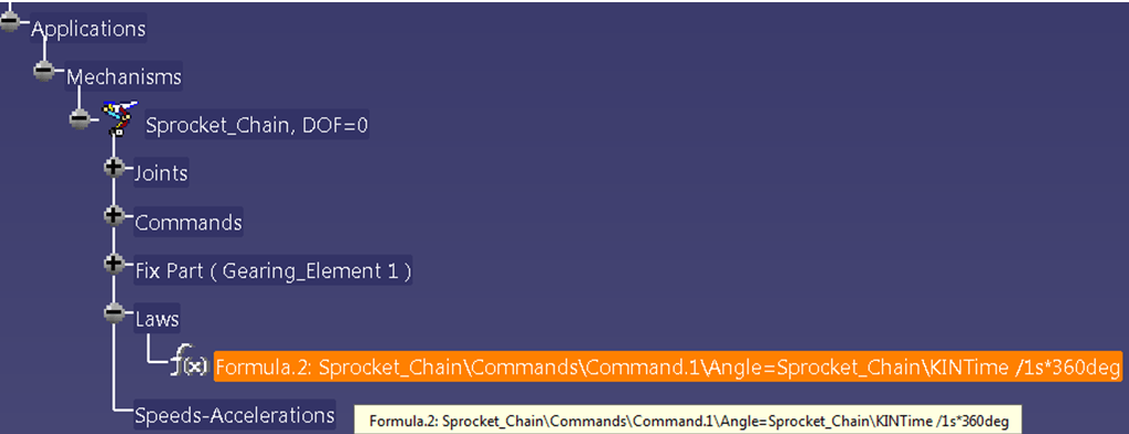 For this one additionally to the command value used for Simulation with commands mode we can use the Time parameter to define the simulation rules. In order to create such rules we must first create a formula in which we put the command value in relation with the time parameter. It is also possible that our assembly can have multiple mechanisms or we can have multiple driven commands but for this exercise we use only one driven command which is “Angle driven”.