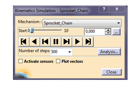 In our case we have only 1 mechanism so, we can directly continue the workflow. In my previous post about Simulation with commands in a similar dialog box we did the simulation by changing the command value. For this one the value we change is the time parameter. But the working procedure is the same. (If that´s not really clear review my previous post about DMU Kinematics)