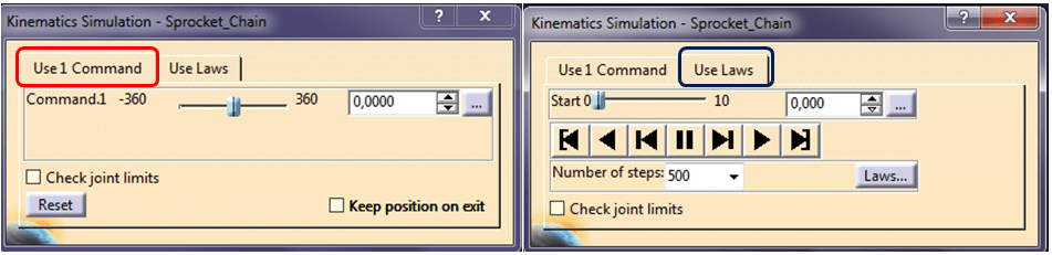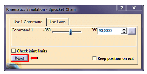 The Kinematic Simulation dialog box has 2 tabs but for this exercise you must stay on the left side Use 1 Comand tab. The one on the right side is similar with the dialog box which opens when you click on Simulation with laws icon (as I ´ve showed you earlier) with the exception of Laws… button which I will present in another post. For now leave the right side untouched, stay on the left side.