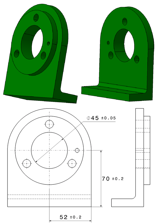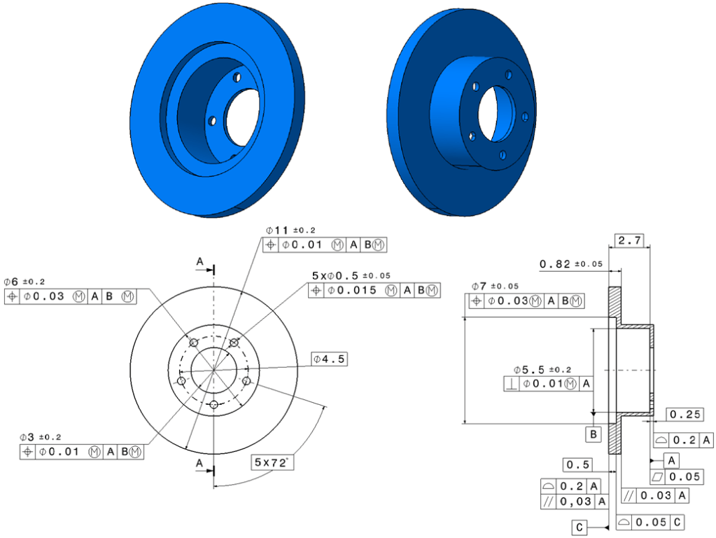 The mounting face in now required to be flat within 0,05mm and then labeled it datum feature A. That makes it an excellent “slab” from which we can launch the rest of the part. Another critical face is explicitly required to be parallel to A within 0.03