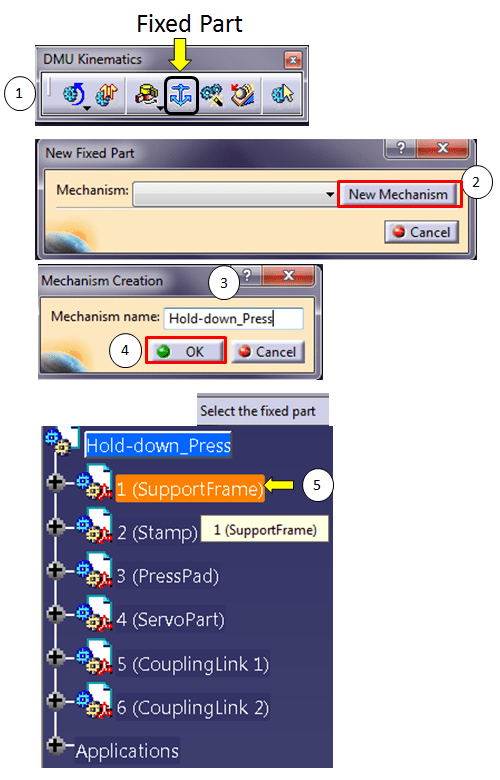 Once your assembly is ready for simulation let’s start by creating the mechanism and fix the reference part. On the DMU Kinematics toolbar click on the Fixed part icon and follow the settings as shown.