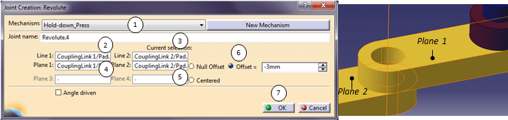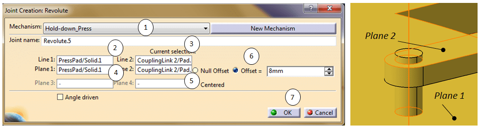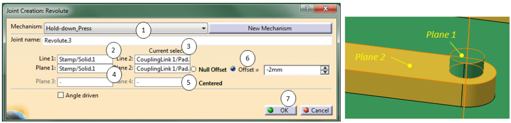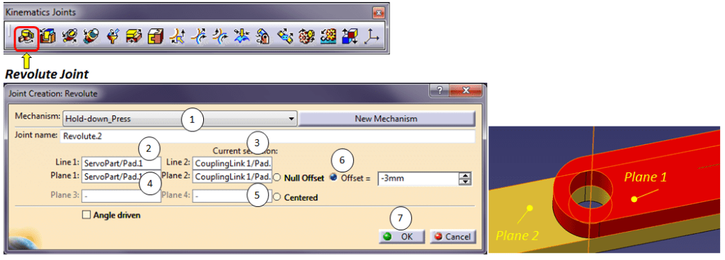 Let’s create the necerassy Revolute Joints. On the Kinematic Joints toolbar, click the Revolute Joint icon and do the settings as show. For the first one tick on “Angle Driven” option too.