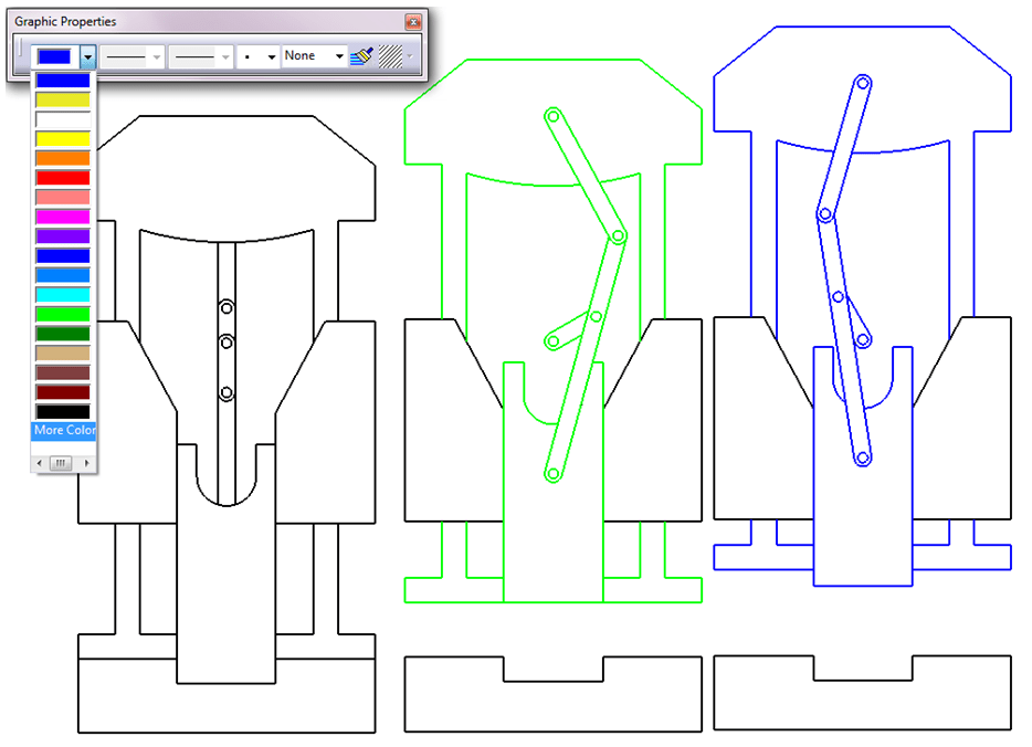 Let’s say you want to see the mechanism at command position = 0°, 120° and 210° and put that on a drawing. For this you must alternatively work with 3D and 2D.