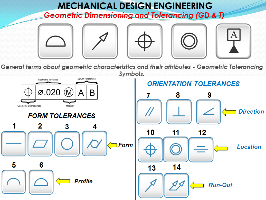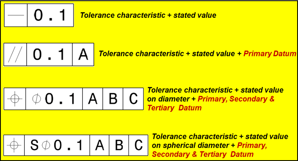 These explanations would be good answers to why GD&T should be used. The chosen geometric tolerance and modifier/modifiers will be shown in Tolerance Feature Indication/Feature Control Frame.