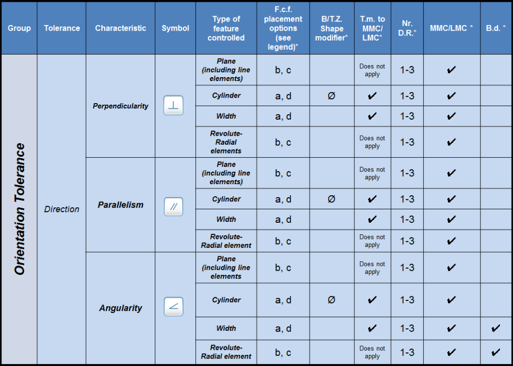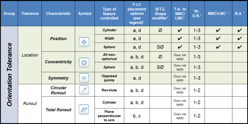 Table 1 summarizes the application options and rules for each of the 14 types of geometric tolerances. For each type of tolerance applied to each type of feature, the table lists the allowable “feature control frame placement options.” Multiple options, such as “a” and “d” appearing in the same box yield identical results. Notice, however, that for some tolerances, the type of control depends on the feature control frame placement. For a straightness tolerance applied to a cylindrical feature, for instance, placement “b” controls surface elements, while placements “a” or “d” control the derived median line.
