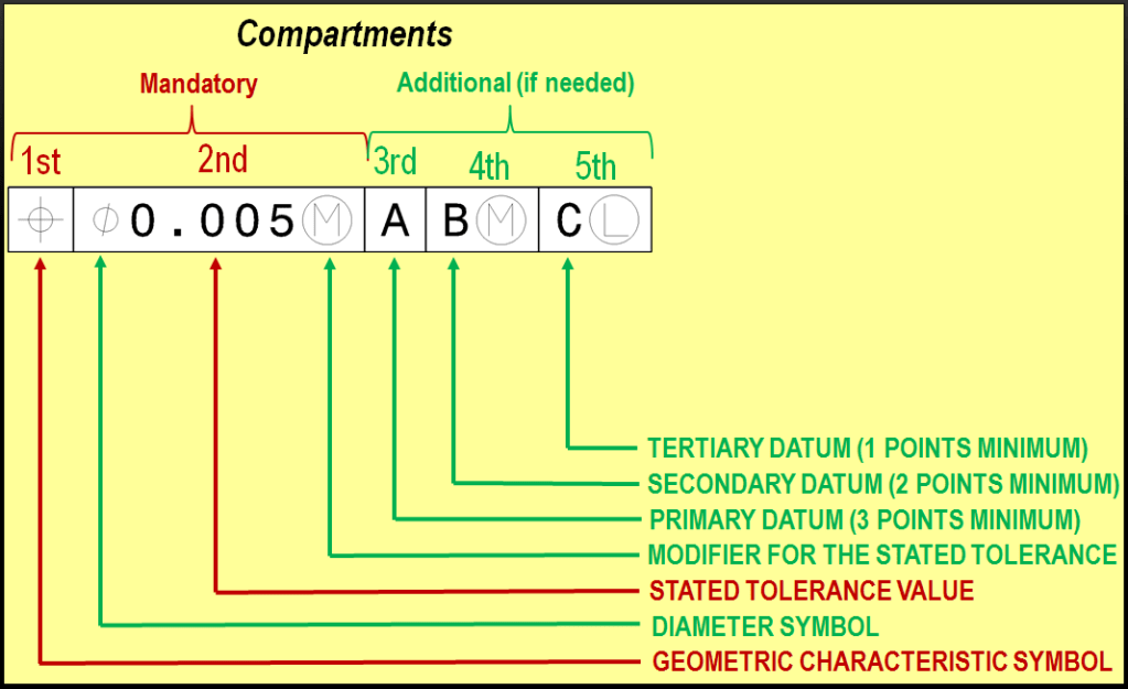 The 3rd, 4th, and 5th compartments are each added only as needed to contain (sequentially) the primary, secondary, and tertiary datum references, each of which may be followed by a material condition modifier symbol as appropriate. Thus, each feature control frame displays most of the information necessary to control a single geometric characteristic of the subject feature. Only basic dimensions (which I will present in another post) are left out of the feature control frame.