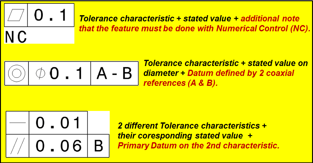 Information to describe further features within the tolerance frame must be entered near the tolerance frame. If several tolerated features are specified for an element, the tolerance specifications may be placed below one another as shown in these examples below: