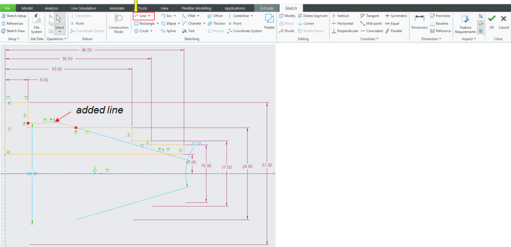Creo will put you back in the sketch workbench. Here click on the Line icon and add 2 new lines as shown.