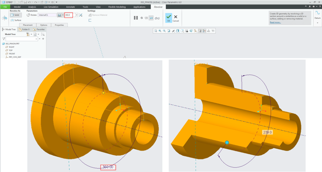 After the sketch definition, Creo will put you back in Revolve workbench where among few other parameters you must define how your part must revolve. In this case it’s a full shaft, therefore keep the 360° rotation angle, and click OK.