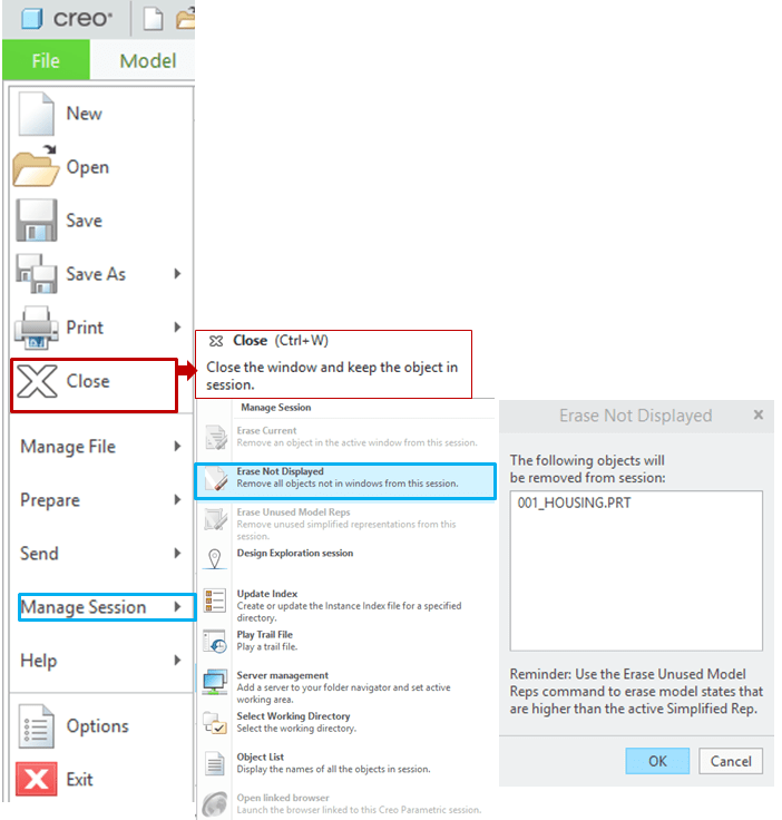To close the file you’ve just created, you have to option to “Close” as displayed, but in this case your part is just not displayed but it still in session. To close it completelly and remove it from your working session you must click on “Erase Not Displayed” option from Manage Session and click OK. Like that your part is completelly closed.