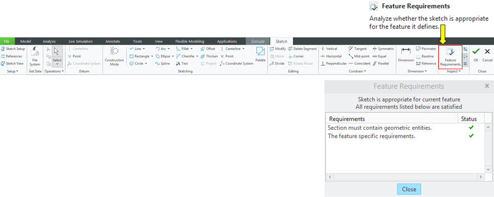 Before to exit the Sketch mode is always useful to check your work one more time, so click on “Feature Requirements” icon as shown and Creo will tell you if everything is OK or not. If your sketch is appropiate all the Requrements in the dialog box will be ticked with a green sign; Click “Close” and click OK to exit the Sketch mode.