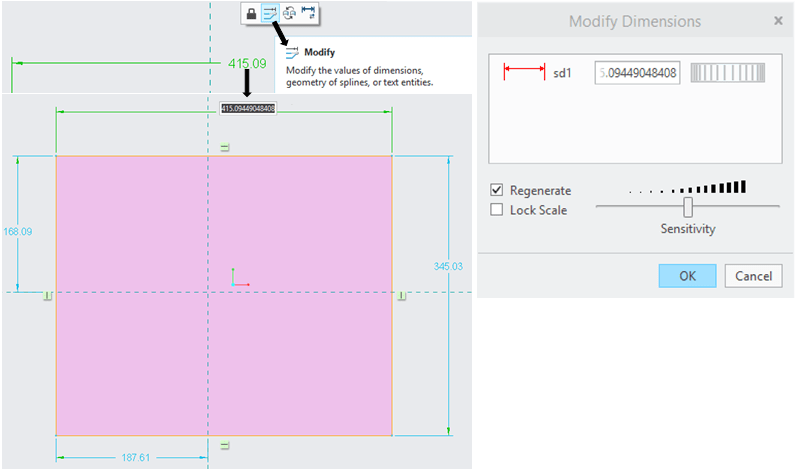 Once the rectangle is ready, yo can either modify the dimensions individually by dirrectly clicking on the dimension value and type the value you want (or you can use the “Modify” icon which gives you a fine-tune control option as well).