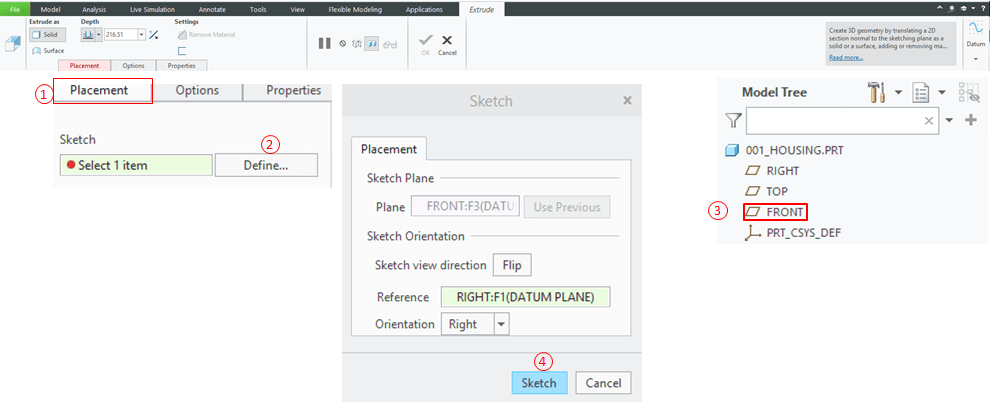 In the Shapes ribbon click on “Extrude” Icon and Creo will guide you in the Extrude mode where you can define the extrusion parameters. So just click the placement tab and follow the steps as shown: