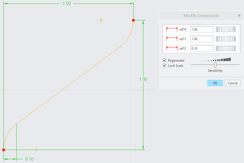 Now CREO is asking me to create a graph that I am going to use to control the turns. If I only draw a line as a slope, that will mean just a constant pitch and the number of turns will be determined by that slope. But if I want it to vary, then all I need to do is to change how this line behaves. For example I add on each line end an arc and I make both with the same radius. The I add a height dimension which will be the Y direction and a width which will be the X direction. Additionally I add another smaller dimension in X direction which will define how the pitch will change on that length portion. Then I select all dimension values and modify them. I tick the Lock Scale option because I want the dimensions to be unitized and I type the dimension as shown.