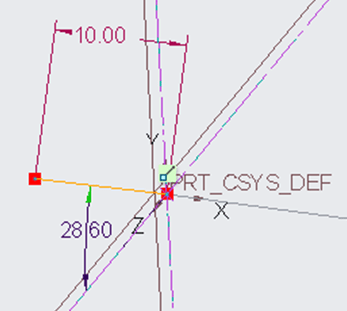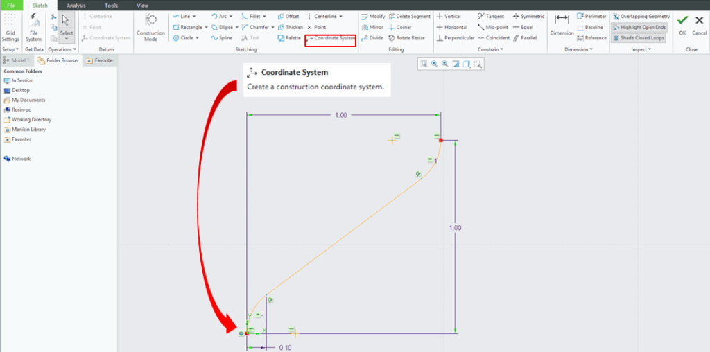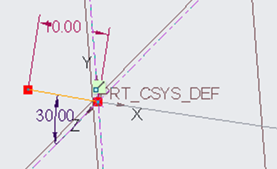 Before to finish the graph feature, the last requirement that CREO wants is to create a Construction coordinate system telling CREO where I want the point 0,0,0 to be. So I click on the Coordinate System icon and I place it on the bottom point of the sketch and I click OK to exit the graph definition.