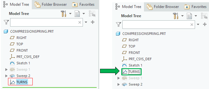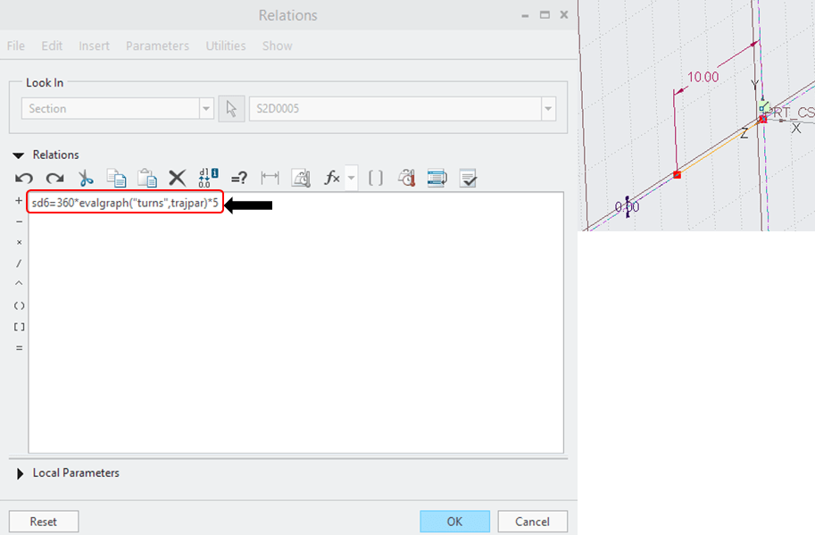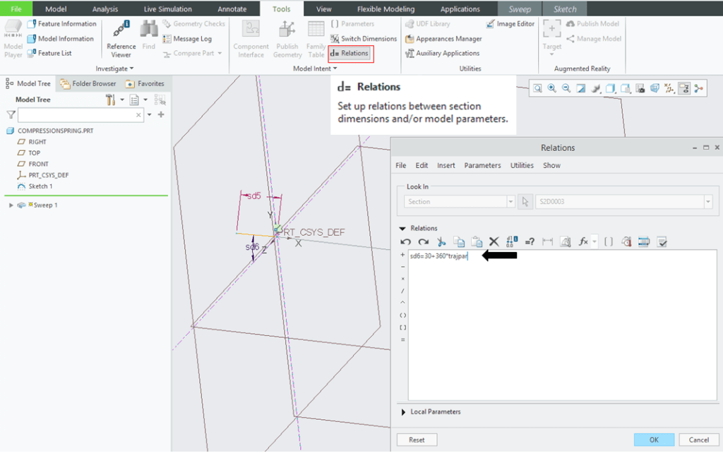 And again in its sketch. I go to Tools tab, I click on Relations icon and I modify the parameters telling CREO to evaluate the Graph. For that CREO requires a term called “evalgraph” and also I must specify in parenthesis and quotes the name of the graph folowed by the item called trajpar. The full line becomes now: sd6=360*evalgraph(“turns”,trajpar)*5
