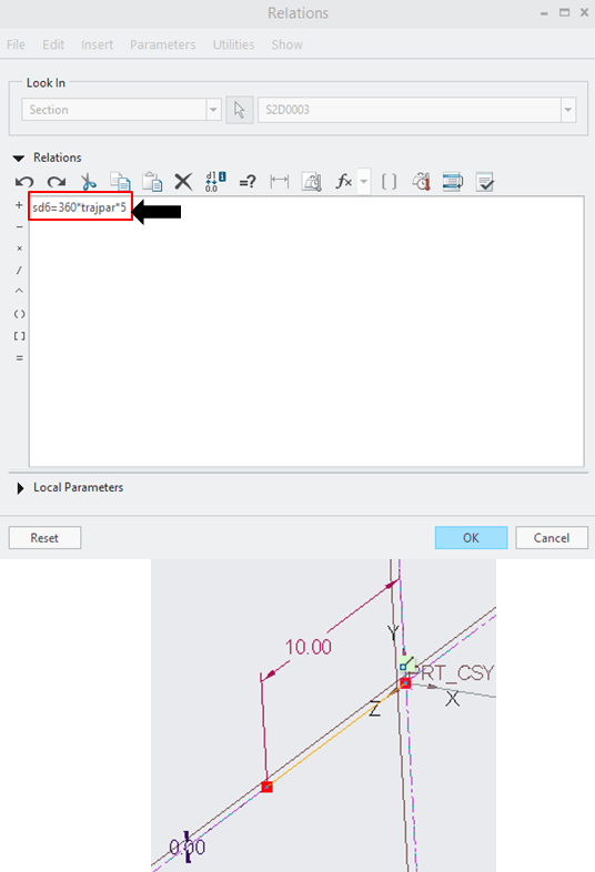 To make it easier I just modify the relation like this: sd6=360*trajpar*5 Where 5 represents the number of turns that I want for my spring. And I click OK. Note that the sketch now is just a straight line of 10mm long.