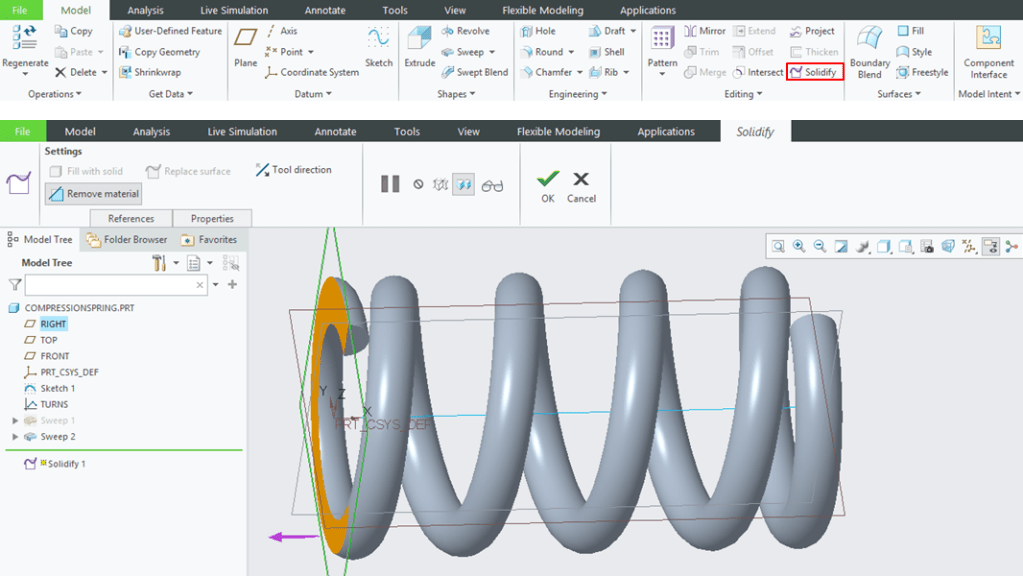 One last adjustment for example if I want to ground the ends I can simply cut the spring like shown. I pick a plane, I click on Solidify icon, I check the side to be removed and I click ok.