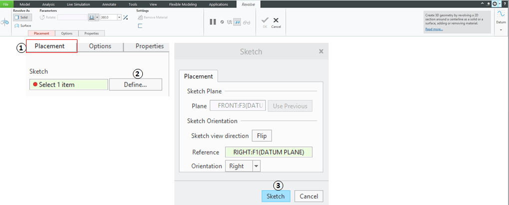 In the Revolve dialog box , Click on Placement and Select the sketch plane.