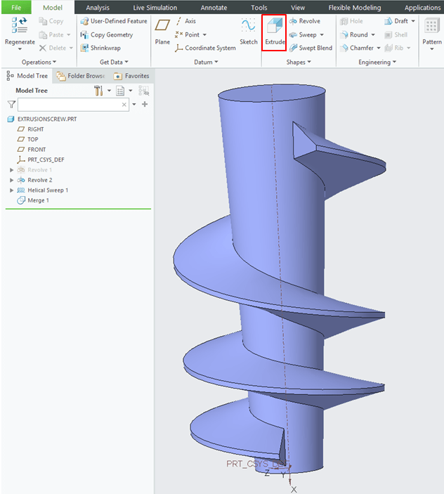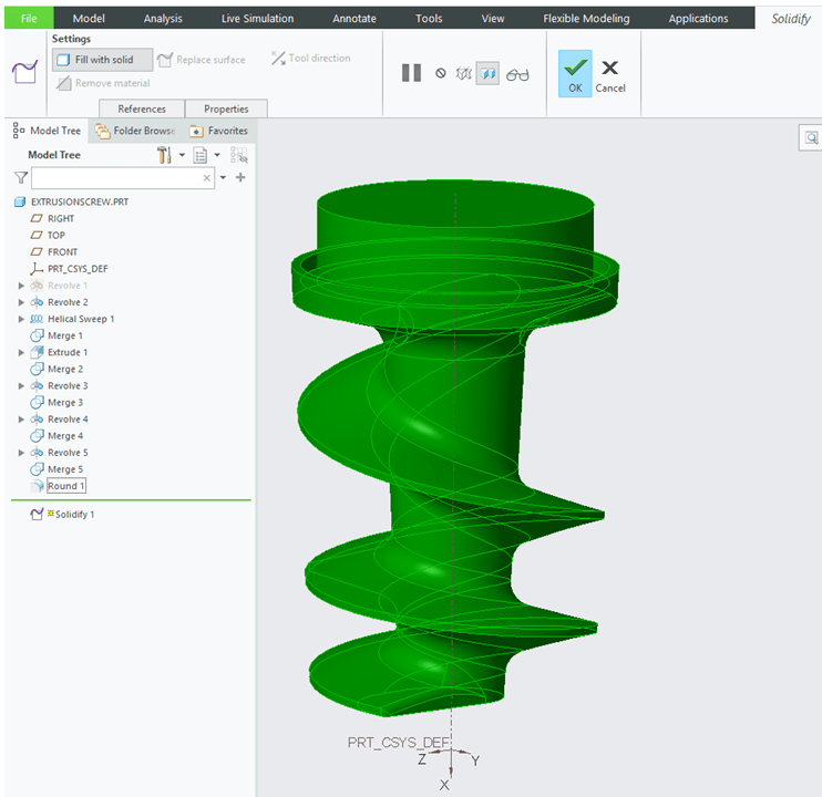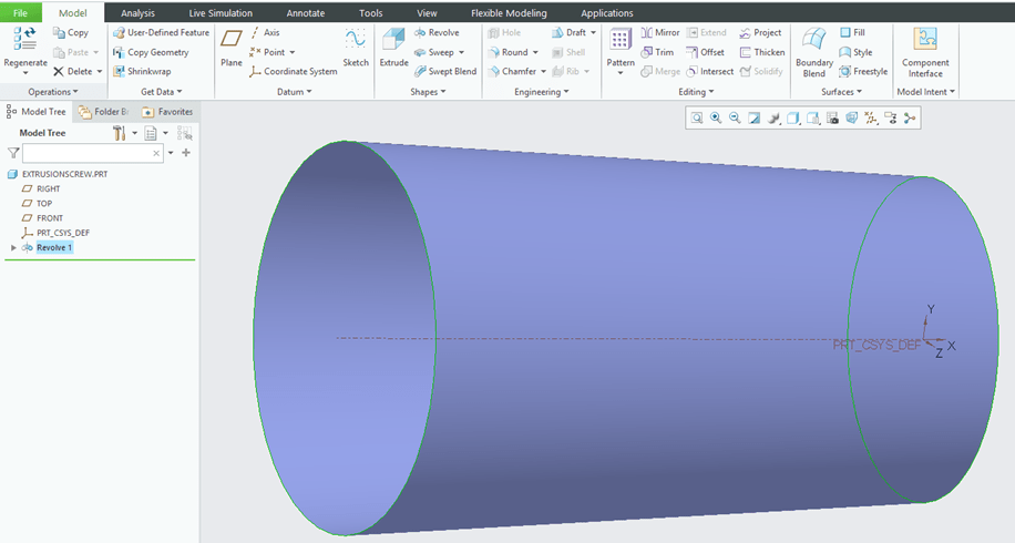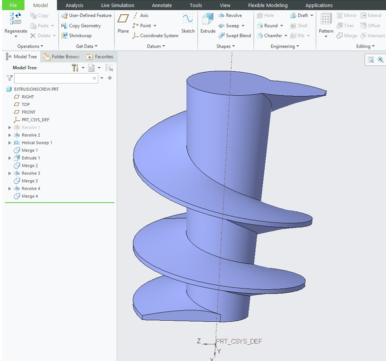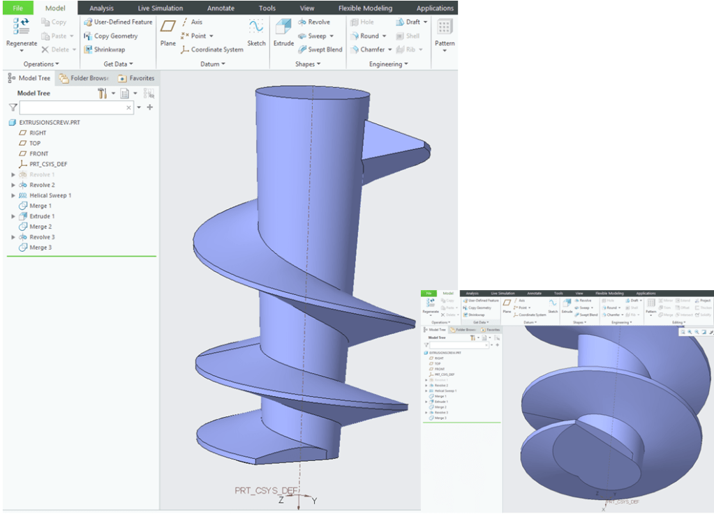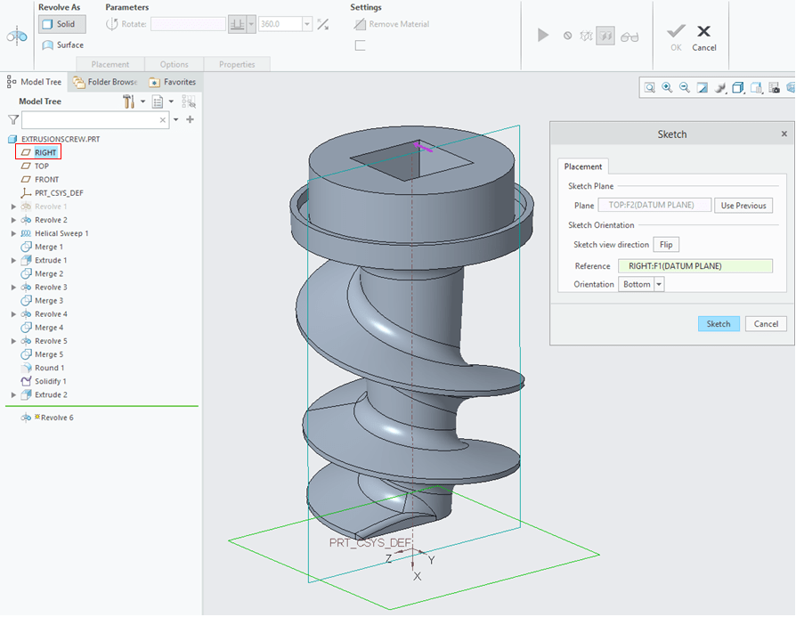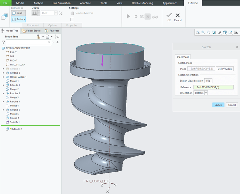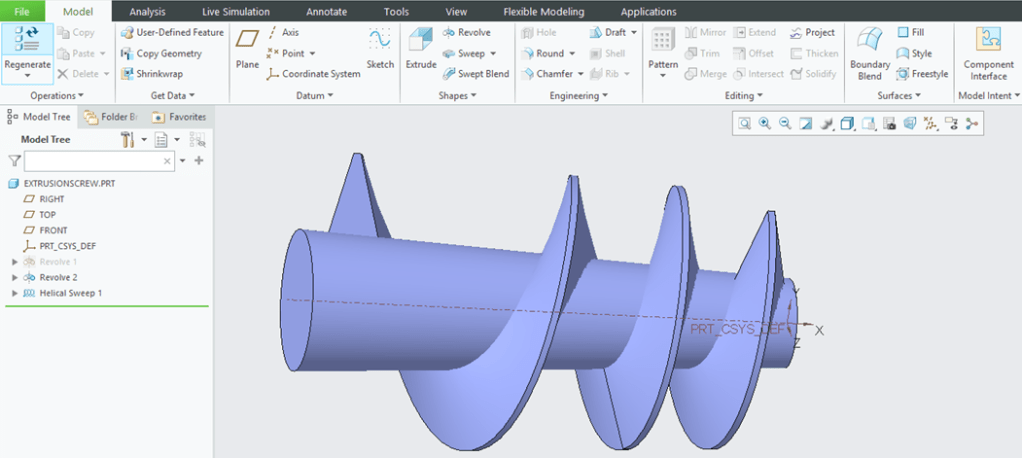 CREO Parametric it is indeed very Parametric CAD platform. Designing with CREO is super effective, it´s a pleasure to work with it, I love this software. It´s powerful, it´s fun, it´s user friendly and you can use it in any type of mechanical design projects. In this post I want to show you an example of how Helical Sweep works and how Surface Design Mode can easily be combined with Solid Design Mode to create a complex shape part such as the Extrusion Screw. Follow the steps as described below and you will get a better understanding about how all that works.