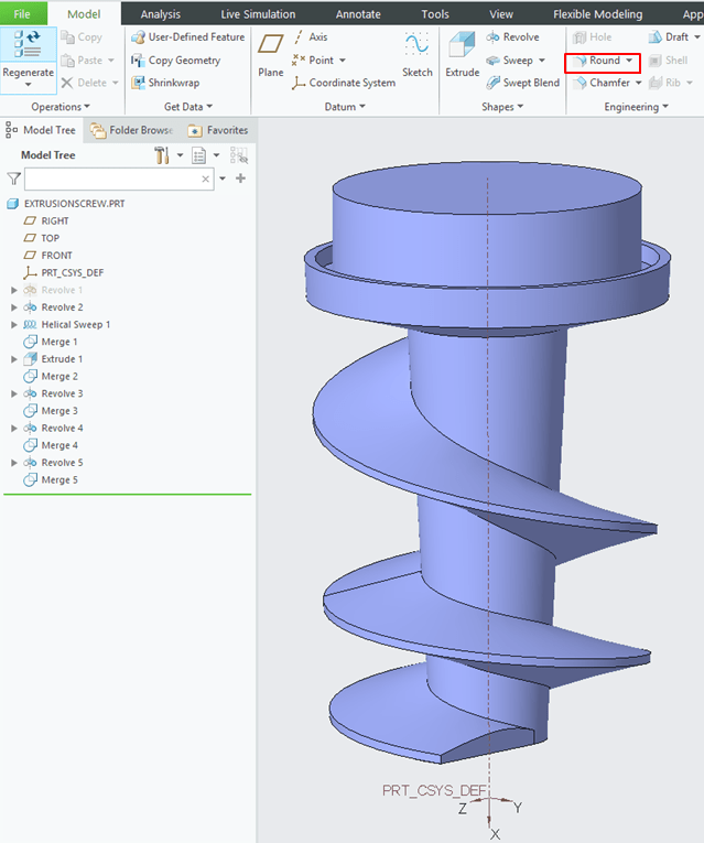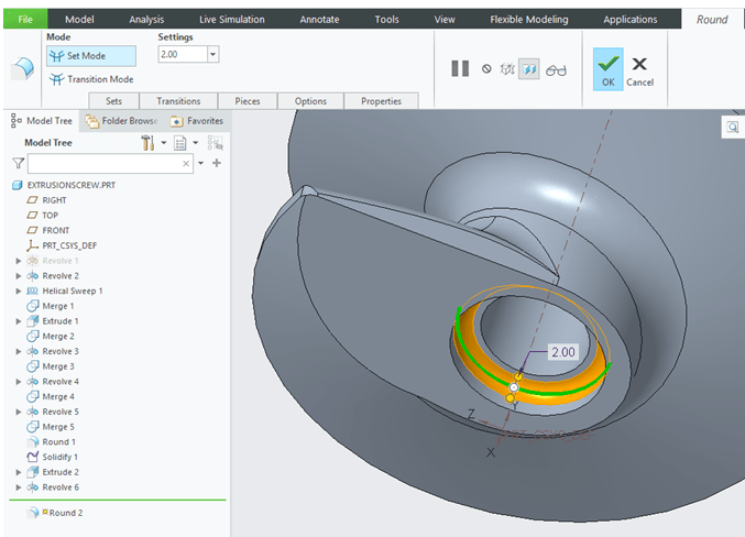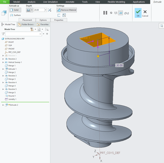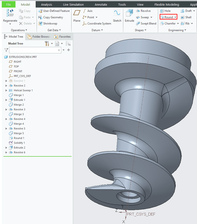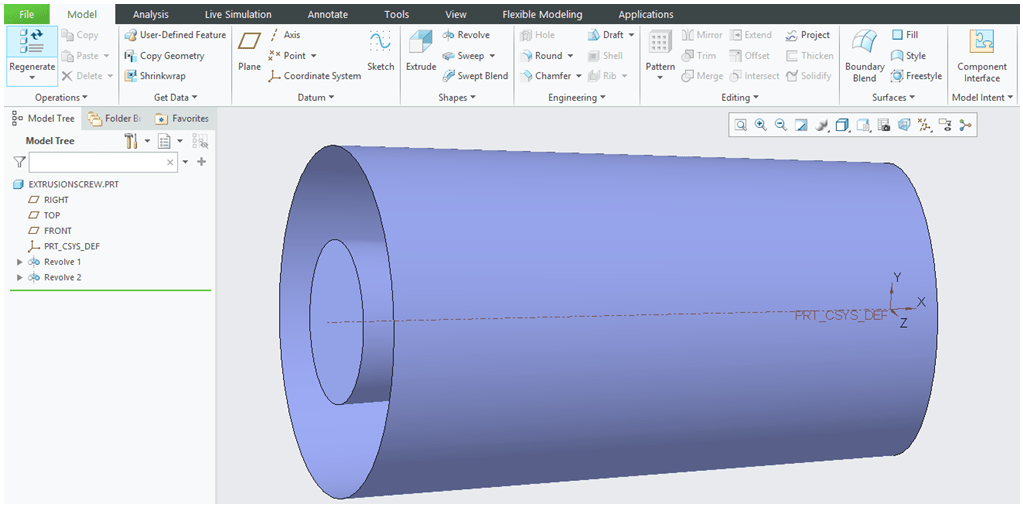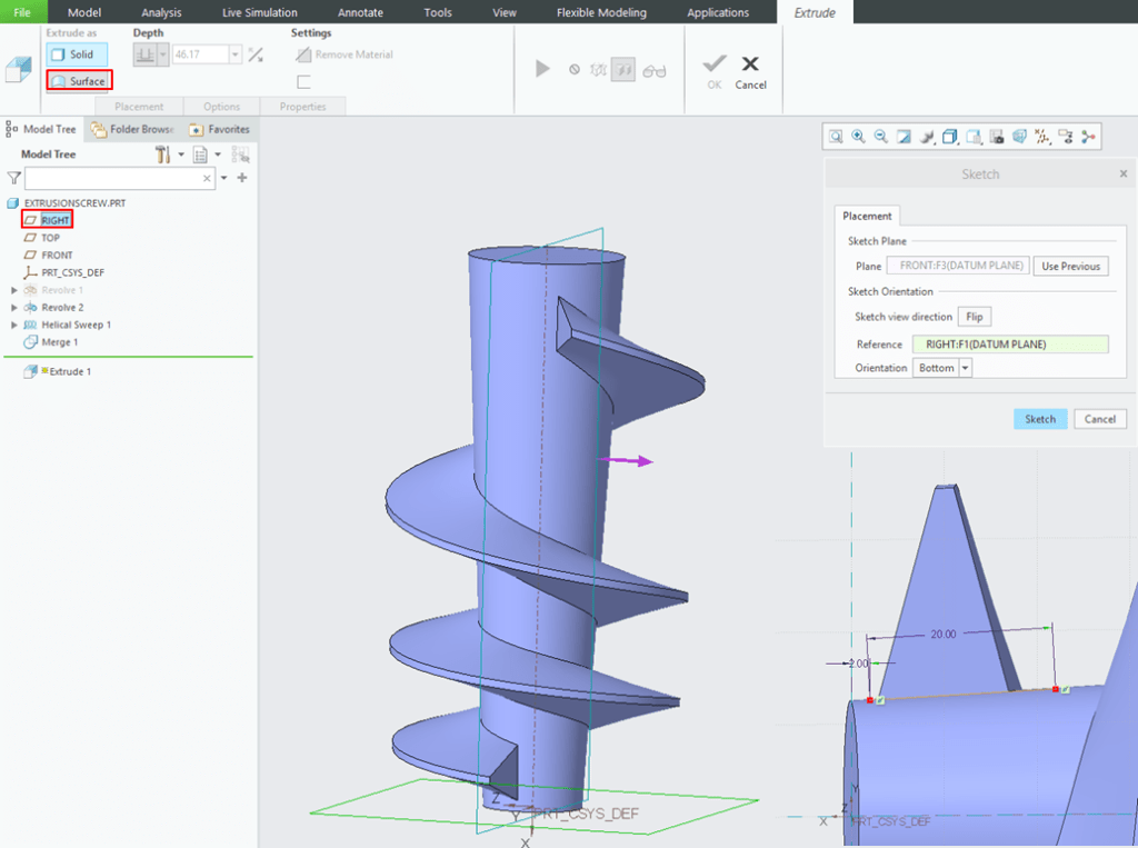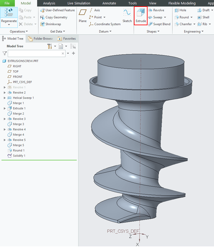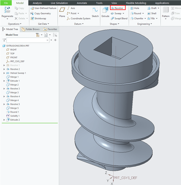 CREO Parametric it is indeed very Parametric CAD platform. Designing with CREO is super effective, it´s a pleasure to work with it, I love this software. It´s powerful, it´s fun, it´s user friendly and you can use it in any type of mechanical design projects. In this post I want to show you an example of how Helical Sweep works and how Surface Design Mode can easily be combined with Solid Design Mode to create a complex shape part such as the Extrusion Screw. Follow the steps as described below and you will get a better understanding about how all that works.