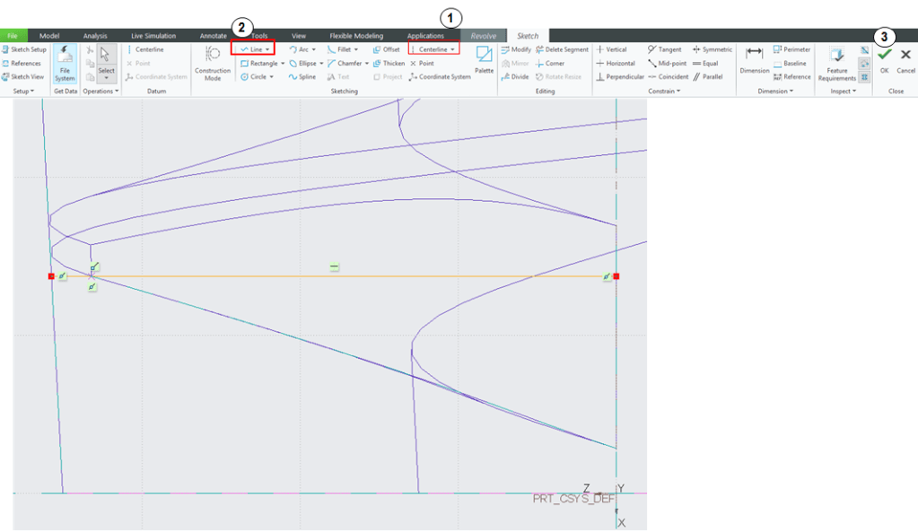 In the sketch mode define a line as shown and click OK to exit the Sketch Workbench.