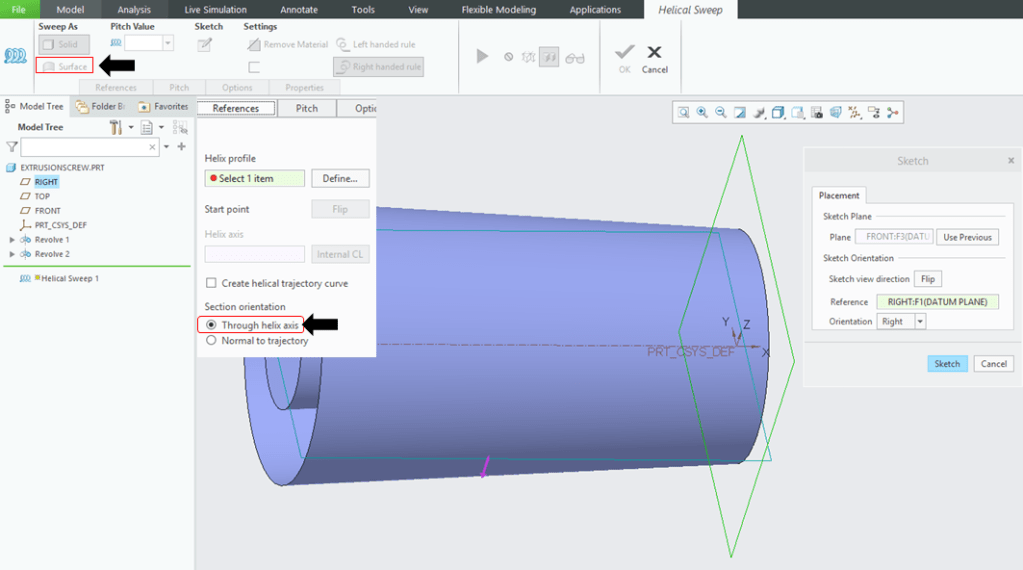 In the Helical Sweep dialog box keep the “Sweep As Surface” option selected and go ahead with sketch definition.