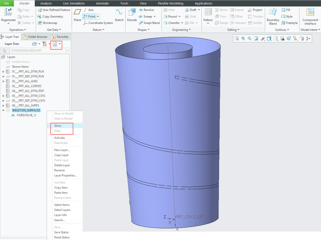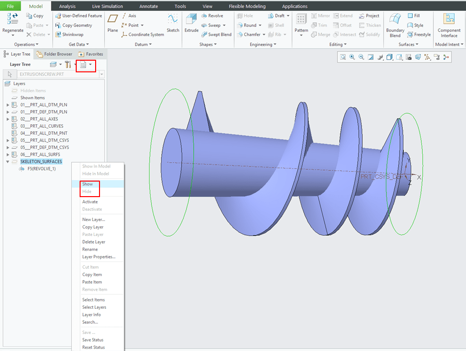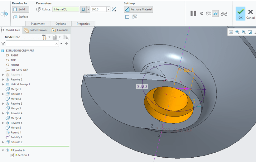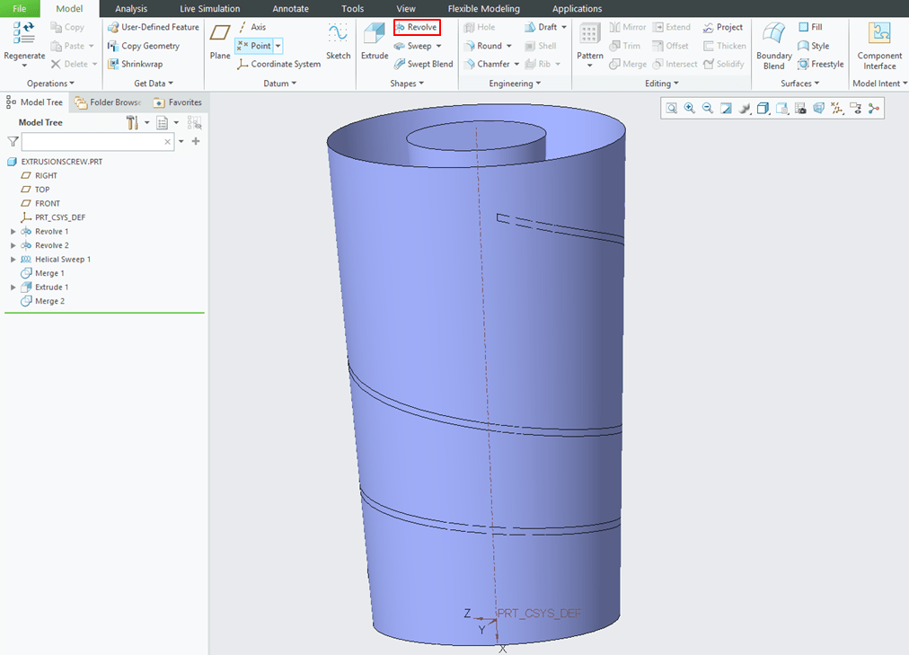 Creo will put you back in Model Workbench, showing you all the surfaces you have created so far. Here you already have the main features necessary to define your Extrusion Screw design. In order to improve the visibility in many cases some construction features are not really necessary to be displayed therefore during the design work is easier to have a smooth design process if these construction features once defined are kept hidden and you can only show them again if necessary. It´s the case here with the Conical Outer Surface. You can simply Right click on “Revolve 1” feature in Model Tree on the left side of the screen and from the displayed menu choose the option ” Hide”. This is the basic and fastest way to hide/show a feature in CREO.