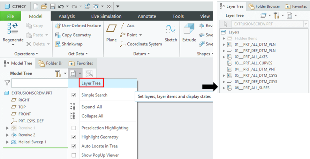 In the Model Tree tab click on the 2nd Icon and from the drop-down menu click on “Layer Tree” option. CREO will show you all the Layers currently available for your Part Design.