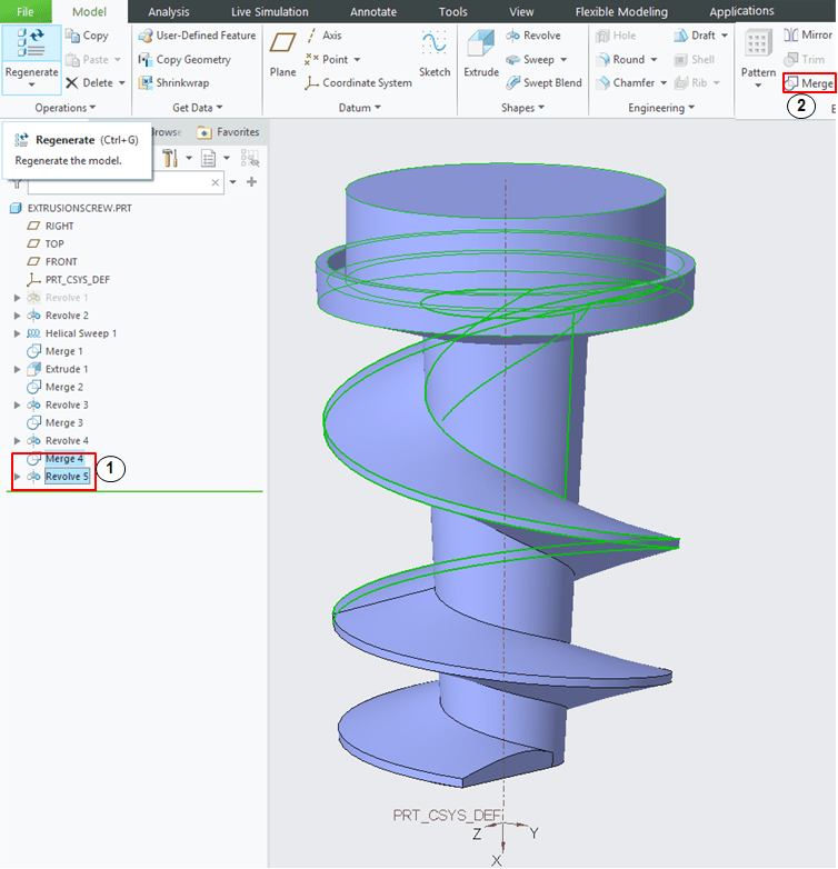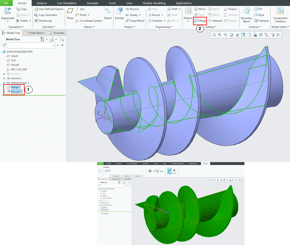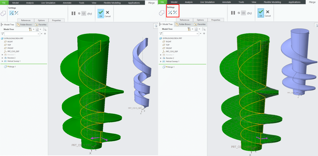 Back in Model Tree display, keep the last 2 features selected (Revolve 2 + Helical Sweep) and Click on the Merge Icon.