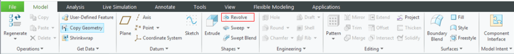 After you created the New Part , Creo put you directly in Model Workbench. Start with a click on Revolve Icon