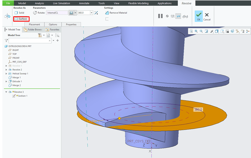 Whenever you sketch an open profile in case you have forgotten to select Revolve as Surface, CREO will immediately inform you that the feature you are about to create will be automatically changed to Surface, so if you see this message, no worries, just click OK and continue your work.