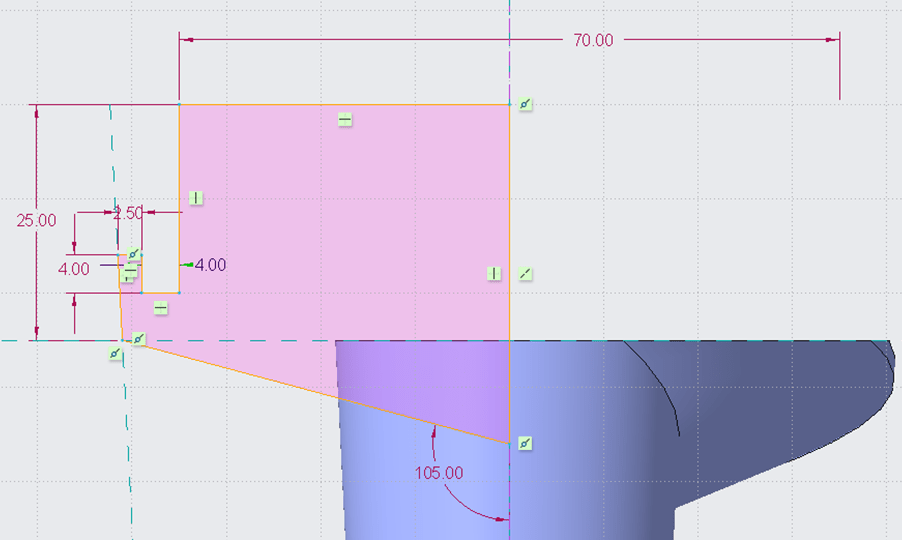 In this Sketch define the profile as shown – note that the left side small line is not vertical but coincident with the Conical Outer Surface line, therefore a little bit tilted. Then click OK to exit the Sketch workbench.