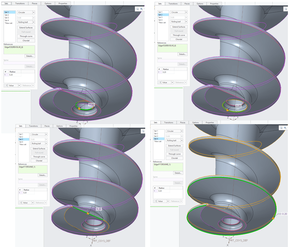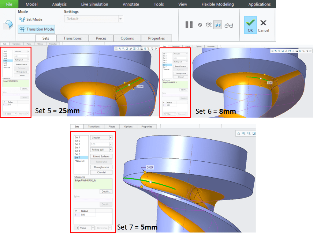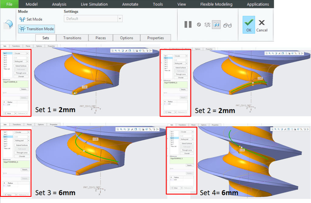 Rounds can be either created in individual feature one after another having different values or they can be created in the one single feature all together but defined in sets with different values. For this design exercise the best way to put rounds on your part is to create them in one single feature in 7 sets each with its own dimension value. Therefore proceed as shown below: