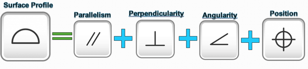 When used without datums, line profile can also be thought to be similar to flatness or cylindricity as these symbols are only more specific versions of the surface profile symbol. When used with datums, profile can mimic all the orientation symbols (perpendicularity, parallelism, angularity) and even control the location and size of a feature or surface. All of these tolerance symbols specify how much a surface of any geometric shape can vary from its true form. All of these symbols have a tolerance zone existing of parallel surfaces surrounding the measured profile.