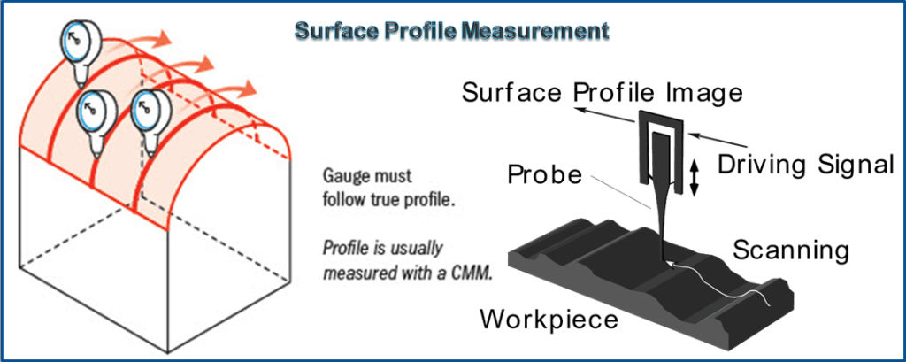 Surface Profile is usually measured using a CMM due to the complexity of some of the surfaces that are called out. The CMM would compare the 3D scan of the profile to the dimensions called out on the drawing to see if it was in spec. If a simple surface is called out, such as a radius on a corner, a height gauge can be used to trace the part as long as the gauge can stay the same distance away from the surface as rotates around the surface. Surface Profile provides complete 3-D control of a feature’s total surface.