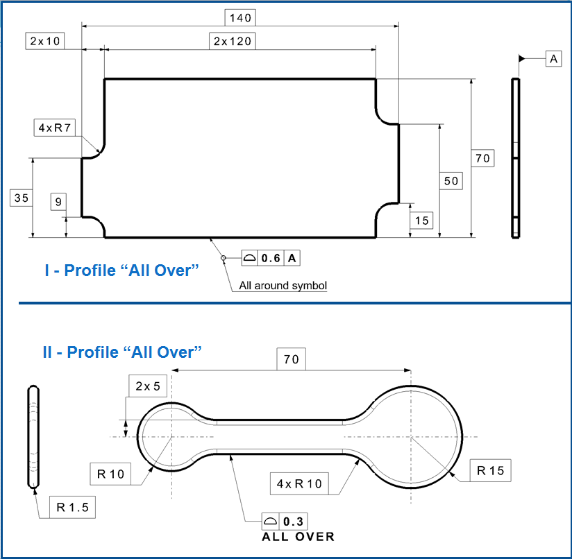 By default, a single profile tolerance applies to a single tangent-continuous profiled feature. There are cases where a feature’s tangency or continuity is interrupted, inconveniently dividing it into two or more features. We’d hate to plaster identical profile feature control frames all around a drawing view like playbills at a construction site. In other cases, different portions of a single feature should have different profile tolerances. An example is where only a portion of a feature is adjacent to a thin wall. Y14.5 provides three tools for expanding or limiting the extent of a profile tolerance: the “all around” symbol, the ALL OVER note, and the “between” symbol. These allow the designer very precise control of profiled features. In my explanations for them, I’ll be referring to the subject view—a single drawing view that shows a profile outline with a profile feature control frame. The “all around” symbol (a circle) modifies a profile tolerance to apply all around the entire outline shown in the subject view regardless of breaks in tangency.