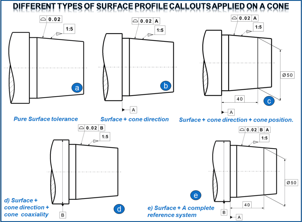 c) Spherical surface – Regular surfaces such as spheres or cones (see Figure 4) cannot be completely controlled only with basic form tolerances. To do that properly we must use the Surface Profile tolerance. Of course, like mentioned above or as shown in Figure 4 datum references can be specified as well.