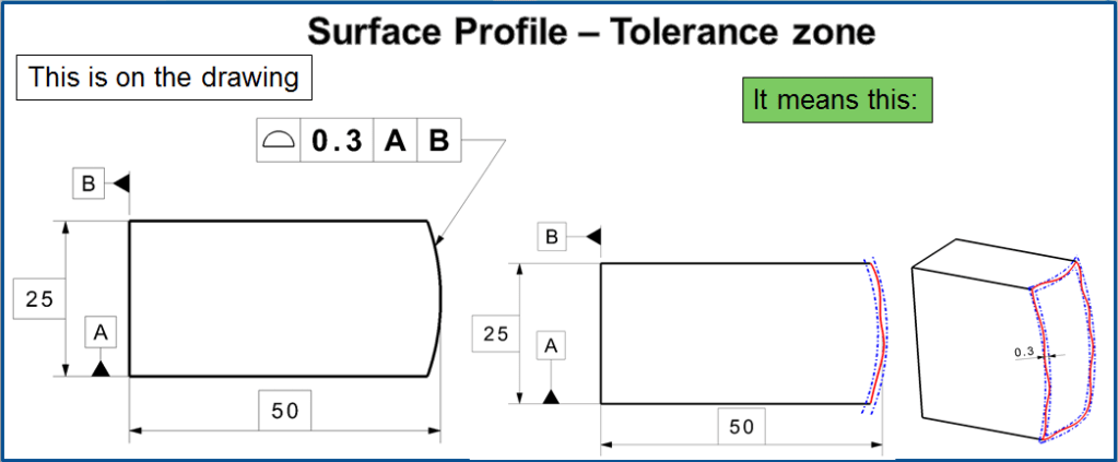 The way how Surface Profile tolerance works is analogous with Line Profile Tolerance (see the Line Profile related article) The only difference is that the Surface Profile provides complete 3-D control of a feature’s total surface, while the Line Profile provides 2-D control of a feature’s individual cross-sectional elements. Either type of control may be related to a DRF (Datum Reference Frame).