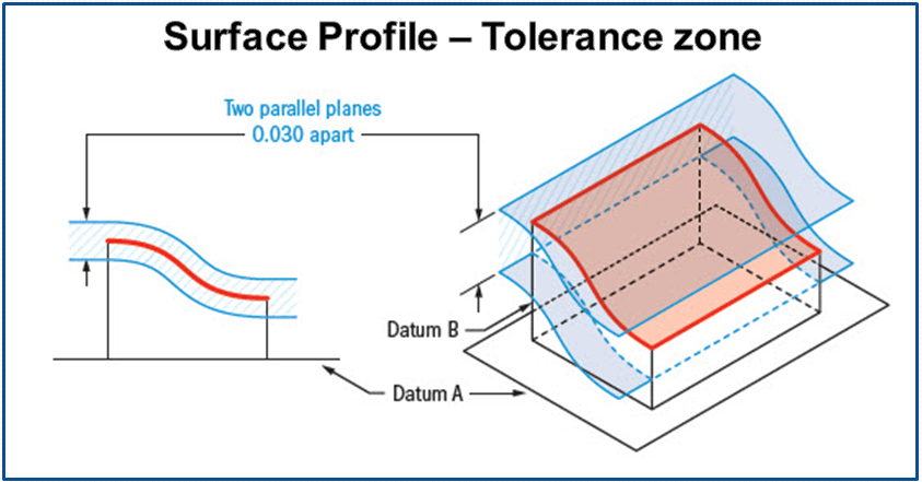 Surface Profile tolerance is a 3-dimensional tolerance that limits the amount of error a surface can have relative to its true profile.