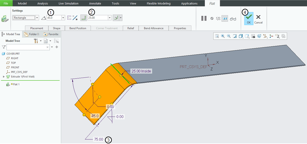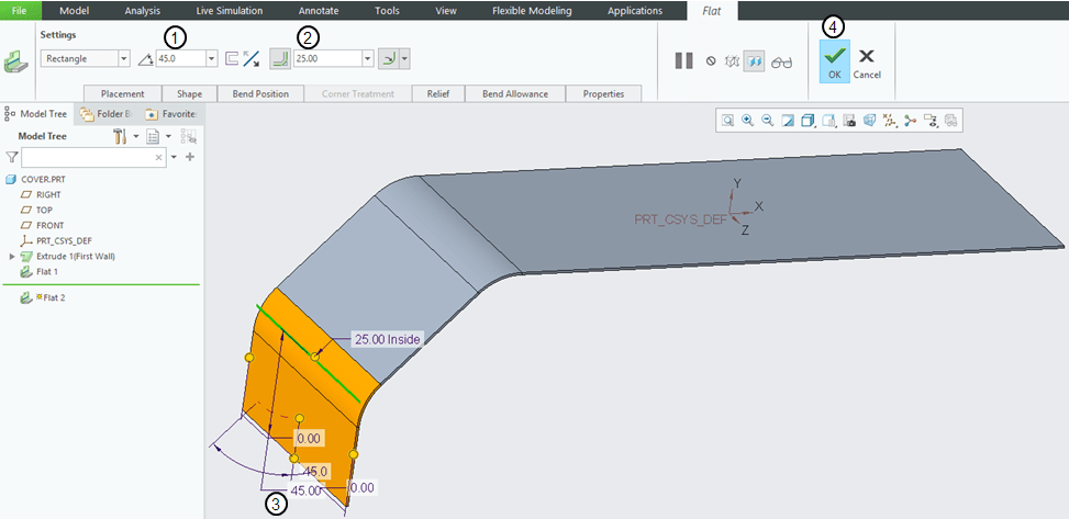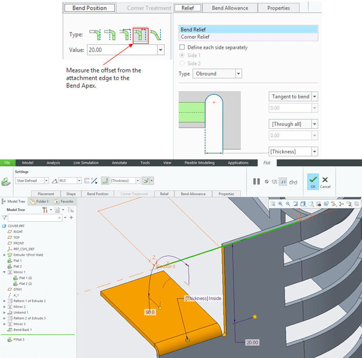 Back in the Flat wall dialog window do the settings for the “Bent Position” and “Relief” and click OK to generate the new feature.