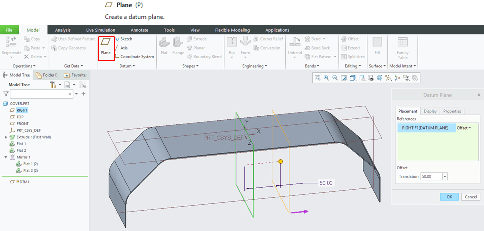 Create an additional datum plane with an offset of 50mm from the Middle plane