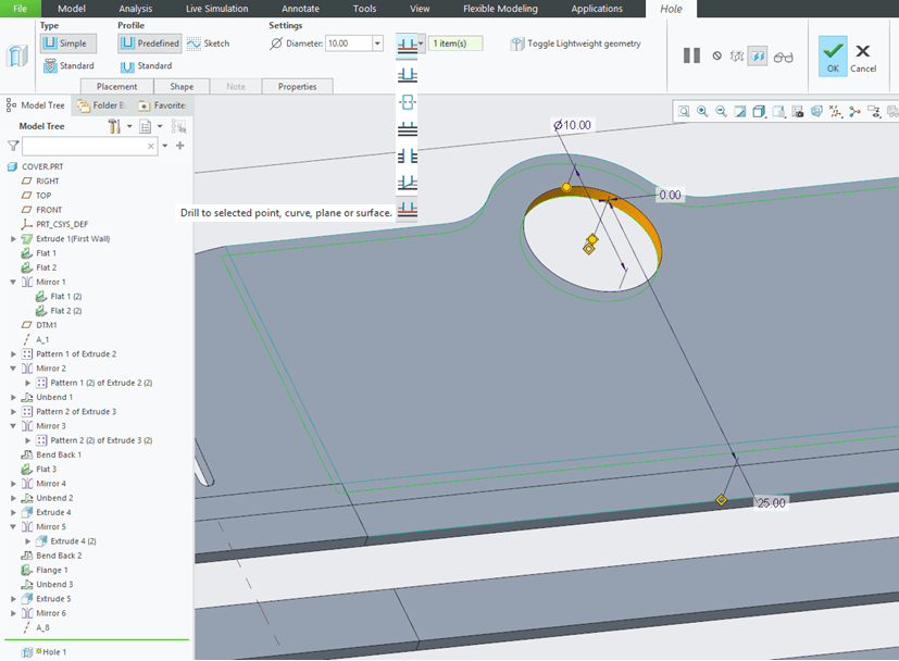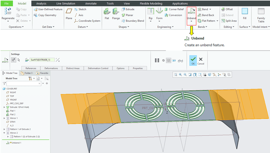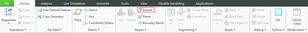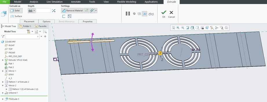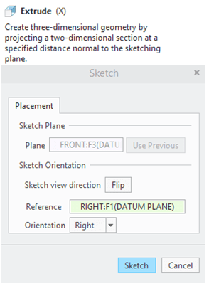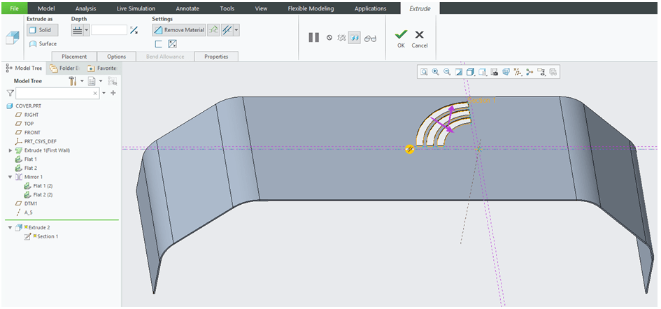 Create a cut-out on the front surface of the cover. To do that CREO Sheetmetal workbench click on the “Extrude” icon –> Select the front surface as Sketching reference…