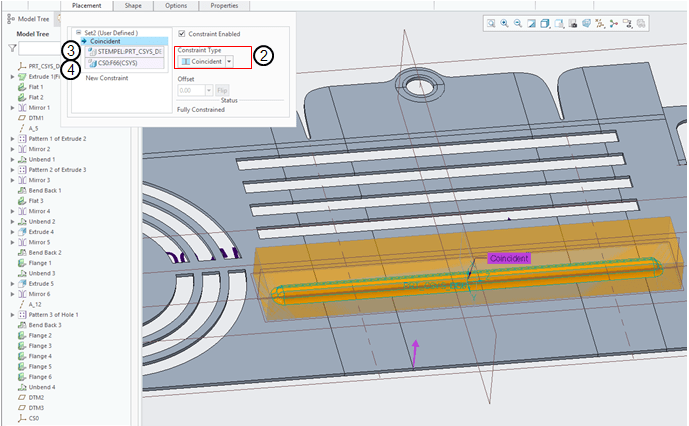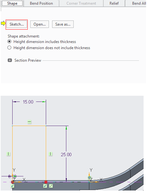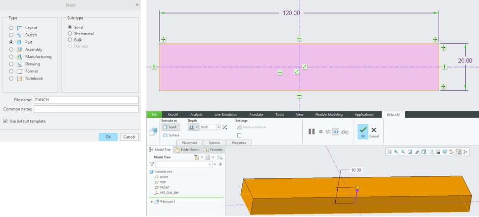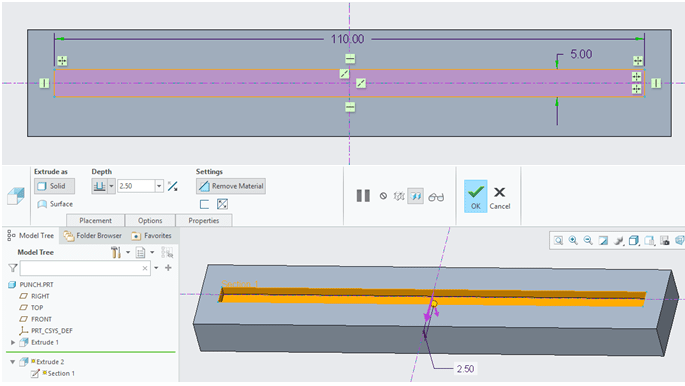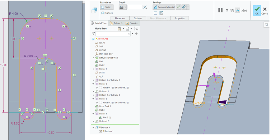 In the Creo Sheetmetal workbench, Click on “Extrude” icon and select the unbended surface as sketch reference, draw the sketch as shown.