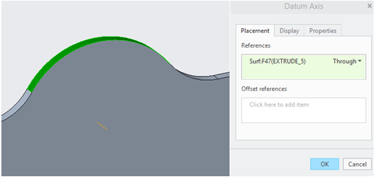 Futher on you will put some holes and pattern them via Table reference; But before that you need to create an additional Datum axis.