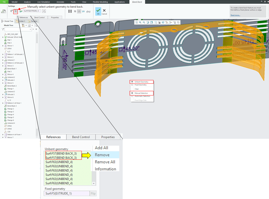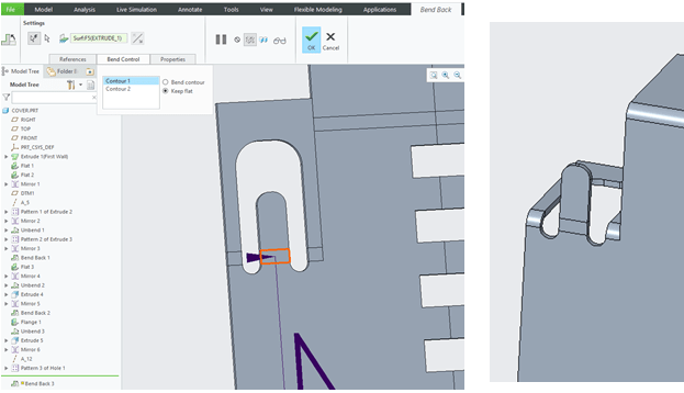 Bend back the part except the 2 little inside latches for the sides. To do this, use the Settings in manual mode and in the “References” tab remove the geometry which you don’t want to bend back.