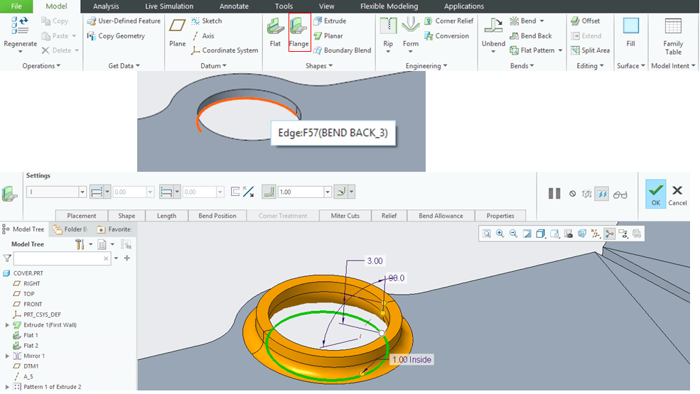 In Creo Sheetmetal workbench click on “Flat” icon to add a new Flat wall on the edge as shown